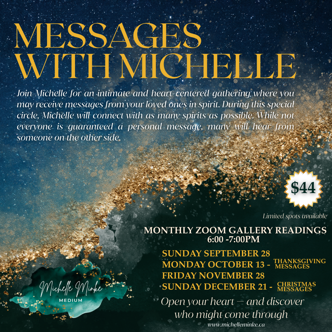 Join Michelle for an intimate and heart-centered gathering where you may receive messages from your loved ones in spirit. During this special circle, Michelle will connect with as many spirits as possible. While not everyone is guaranteed a personal message, many will hear from someone on the other side.