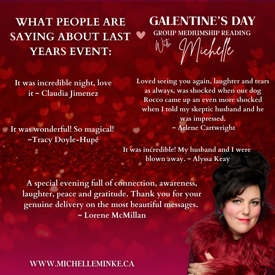 Come with your besties and enjoy a Galentine's Group Reading with Michelle. This 2 hour event is held in Calgary at the Cardel Theatre. During this event I will bring through as many messages from the other side as possible.