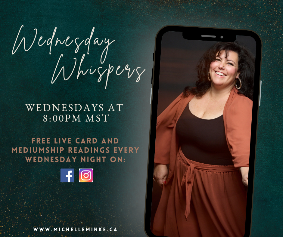 Join me every week for Wednesday Whispers from Heaven- Online Free Readings on my Facebook, Instagram and You Tube Page. In this special hour I bring messages through from the other side from loved ones who have passed and offer live card readings. 8pm MST every week on Facebook.